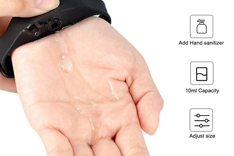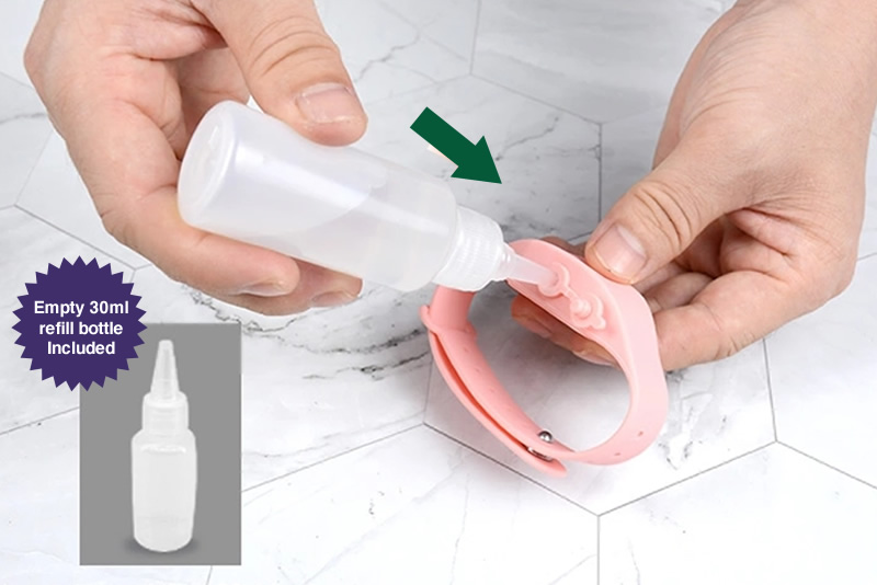 Each silicone bracelet comes with a small squeeze bottle to aid refilling.